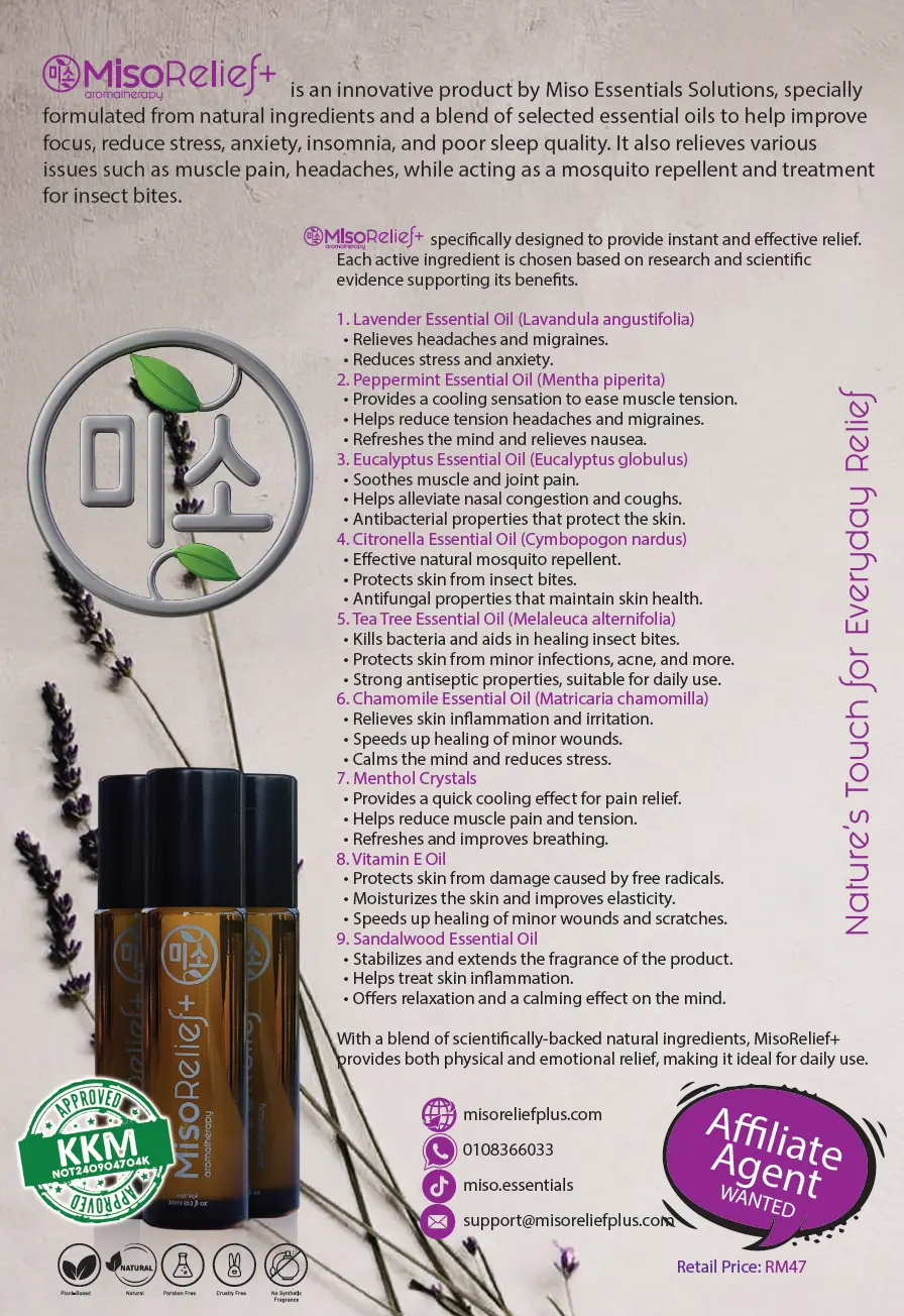 MisoRelief+ is an innovative solution that blends the power of nature with modern science to deliver fast and effective relief. Formulated with carefully selected natural ingredients such as eucalyptus, peppermint, and citronella essential oils, MisoRelief+ is specially crafted to address a range of issues — from muscle aches and headaches to stress, and even mosquito bites and repellent needs.